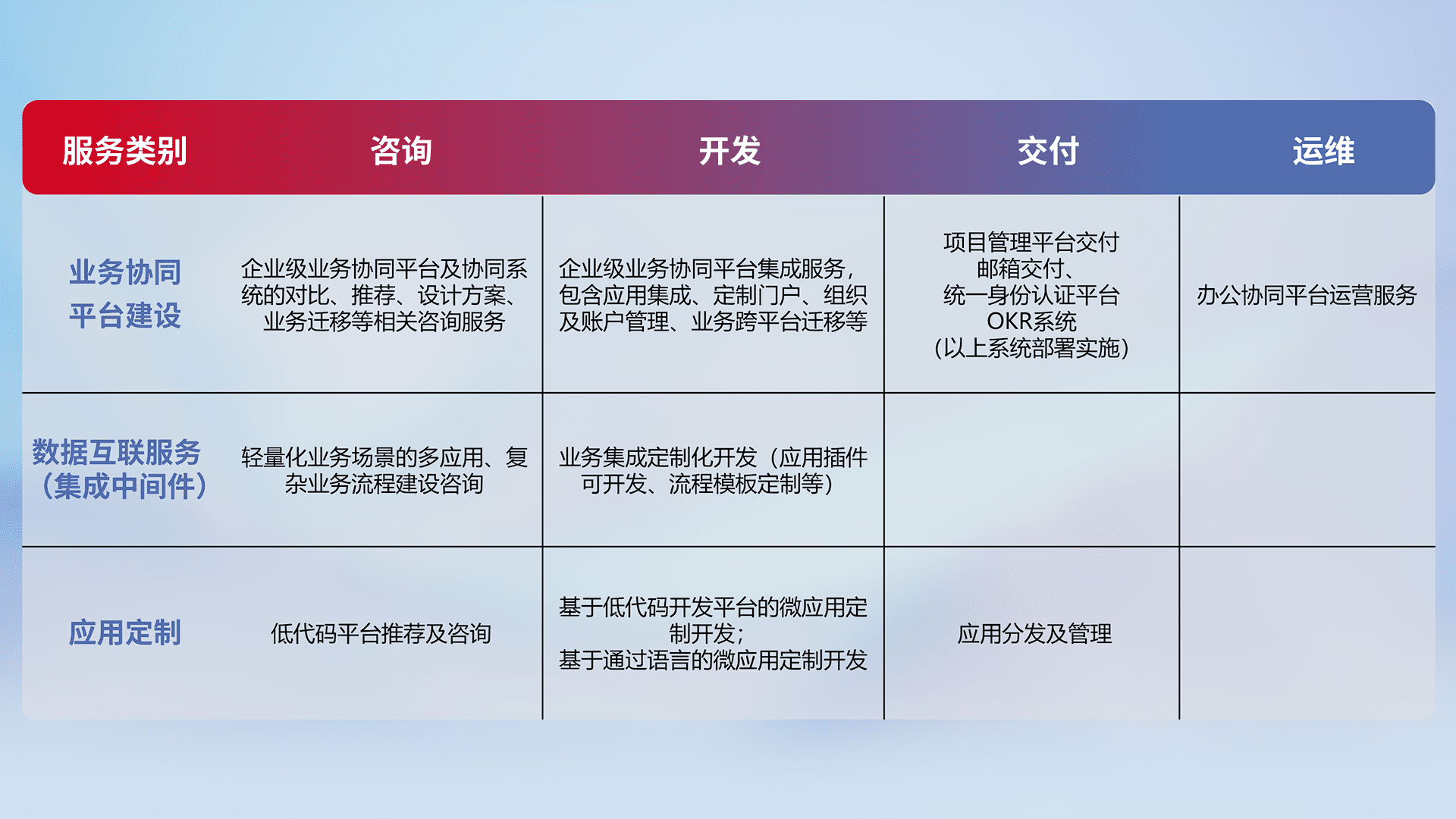 针对钉钉、、、企微、、、IDaas等平台级产品提供产品的规划、、方案、、交付、、定制化开发等服务,,实现如统一协同办公、、、、智能客户服务、、混合会议管理、、智能数据查询、、等业务场景,,,,实现数字化转型。。